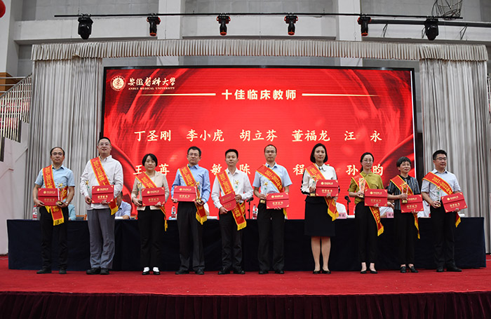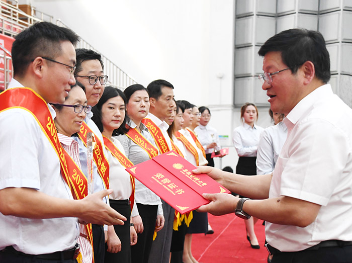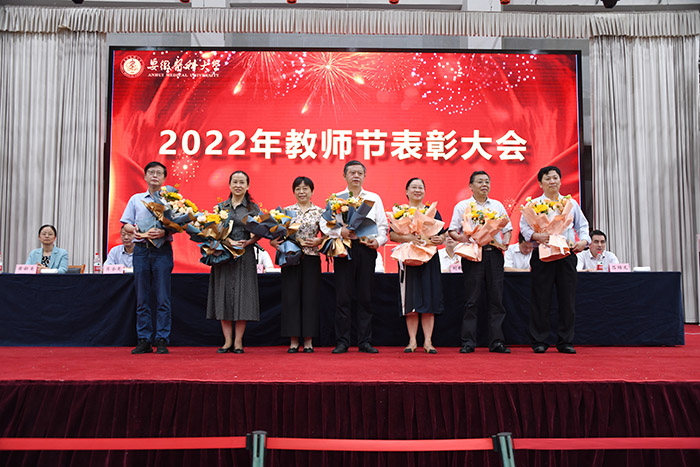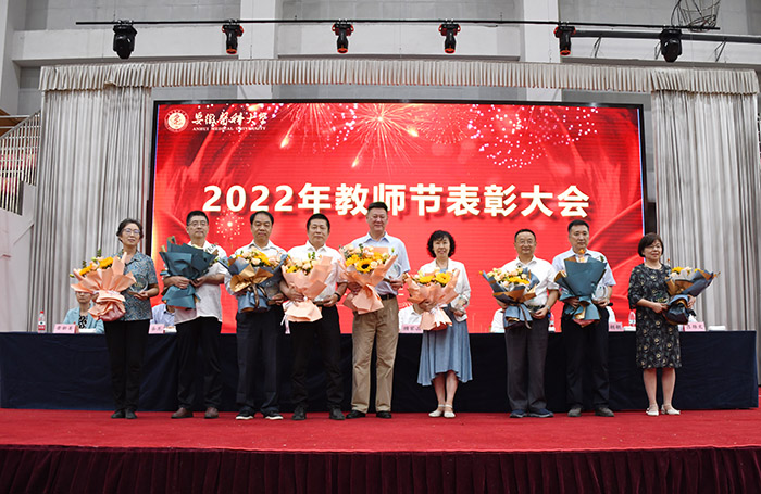 校领导分别为校2021-2022年度优秀教师、优秀教育工作者、管理服务育人示范岗人员以及“十佳基础教师”“十佳临床教师”代表颁发了荣誉证书和奖杯。会上还为退休教职工代表和工作满35年的在职教职工代表颁发纪念奖杯并送上鲜花。