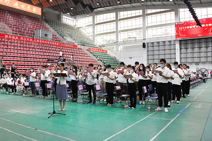工作满35年在职教职工、卫生管理学院院长陶芳标教授,校“十佳基础教师”、基础医学院余莉教授,校“十佳临床教师”、第一临床医学院(第一附属医院)主任医师李小虎分别作为教师代表发言。基础医学院谢芬芬副教授带领新进教职工面向国旗庄严宣誓。