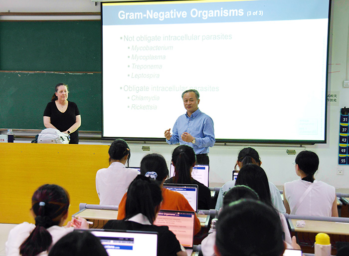 课堂上,翁建平认真听取授课内容,边听边记,仔细考察教师的教学状态和学生的听课状态。课后,他与美方合作高校阿肯色州立大学的教师奥黛丽·马德琳·福尔松进行交流探讨,对她认真负责的工作态度以及为学校国际化事业发展作出的贡献给予充分肯定,对两校合作办学项目取得的成果表示高度赞赏。翁建平表示,我校与美国阿肯色州立大学合作已有8年多,交流互动密切,开展了一系列务实的教育合作交流活动,在培养国家卫生健康急需紧缺人才等方面取得了良好的社会效应。希望今后继续加强合作交流,融汇中西方优秀文化,形成互利共赢的生动局面,共同打造中美高等教育合作的生动典范。