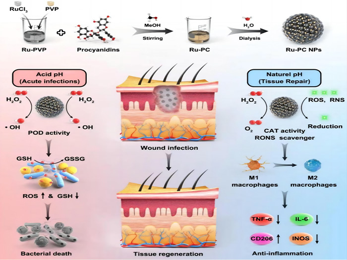 耐药细菌感染会阻碍伤口的愈合过程,从而阻碍伤口的修复;同时,伤口处的炎症会引发活性氧的产生,造成氧化应激,损伤蛋白质和细胞。这导致了慢性伤口难以愈合,带来严重的风险。为此,研究团队设计了一种具有多种酶活性的新型纳米酶钌配位原花青素(Ru-PC)纳米颗粒,以帮助伤口愈合和对抗细菌感染。