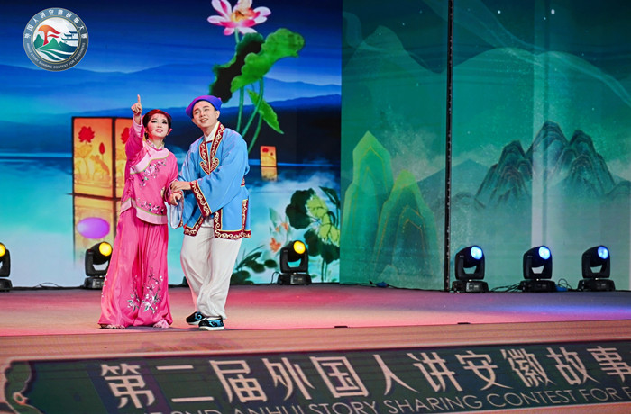 决赛分为知识问答、风物推荐、汉语演讲和才艺表演四个环节。我校两位参赛留学生章伯涵、容佳琪对中国传统文化特别是安徽传统文化如数家珍,满分通过知识问答环节,并和两位留学生助演同学在现场风物推荐环节进行了精彩的展示。才艺展示中,章伯涵表演了陈式太极拳,动静相随、刚柔相济,一套动作行云流水,充分展示了太极拳的力量之美与灵动之美,赢得阵阵掌声。容佳琪带来的黄梅戏《夫妻观灯》选段也给评委留下深刻印象。